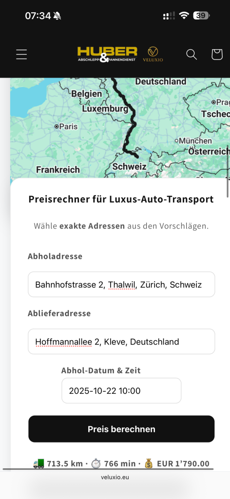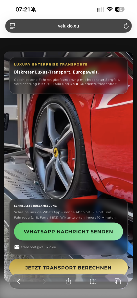 Projekt: link: veluxio.eu – Luxus Fahrzeugtransporte Europa